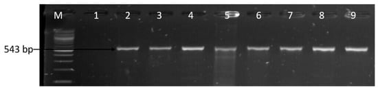 Gel image of the PCR-confirmed catll gene. Lane M: DNA ladder (100 bp); lane 1: negative control; and lanes 2–9, Campylobacter isolates that harboured the catll gene (543 bp).