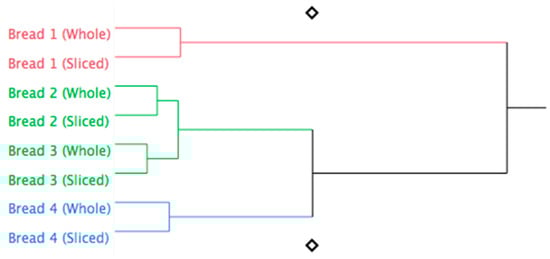 Furthermore, the hierarchical cluster analysis on the volatile aroma compounds (Figure 2) identified four statistical units as a function of the bread’s formulation (Table 2), regardless if whole or sliced bread was analyzed, thus indicating that in the experimental conditions adopted, the main effect was played by fortification.
