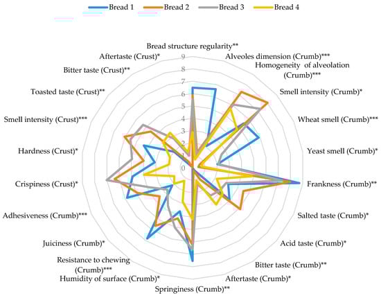 Sensory profile of cooked breads. Significance level *** p < 0.001, ** p < 0.01, * p < 0.05.
