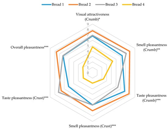Hedonic profile of cooked breads. Significance level *** p < 0.001, ** p < 0.01, * p < 0.05.