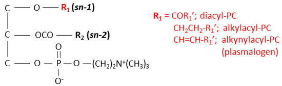 Structures of diacyl-, alkylacyl-, and alkenylacyl-phosphatidylcholine (PC) species.