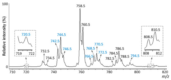 Mass spectrum obtained from the total lipid extract of pork chop sections using LC-MS/MS. Precursor ion scanning at m/z 184.1 in positive ion mode was performed. Peaks with black m/z values indicate diacyl-phosphatidylcholine (PC) species, while those with blue m/z values indicate alkylacyl- and/or alkenylacyl-PC species. All species were detected as [M + H]+ ions.