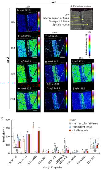 To investigate the distribution and composition of alkylacyl- and/or alkenylacyl-PC species in loin, intermuscular fat tissue, transparent tissue, and spinalis muscle of the pork chop section, we reconstructed ion images using their m/z values (Figure 5b–j). The mean detection intensities of alkylacyl- and/or alkenylacyl-PC species from each tissue were calculated (Figure 5k). The ion images of m/z 782.5, 806.5, and 810.5 are the mixed ion images of PC (alkylacyl 16:0/18:2) and PC (alkenylacyl 16:0/18:1), PC (alkylacyl 16:0/20:4) and PC (alkenylacyl 18:1/18:2), or PC (alkylacyl 18:0/18:2), PC (alkylacyl 18:1/18:1), and PC (alkenylacyl 18:0/18:1), respectively, because they were detected as the same m/z value (Figure 5d,g,j). Similarly to diacyl-PCs, alkylacyl- and alkenylacyl-PC species showed unique distribution patterns among the tissues. All alkylacyl- and alkenylacyl-PC species were primarily distributed in the loin and spinalis muscle tissues (Figure 5b–k). Alkylacyl- and/or alkenylacyl-PC species containing 16:0 at the sn-1 position and 20:4 at the sn-2 position (Figure 5f,k), 18:0 or 18:1 at the sn-1 position and 18:1 or 18:2 at the sn-2 position (Figure 5g,k), and 18:1 at the sn-1 position and 18:2 at the sn-2 position (Figure 5i,k) were also distributed in intermuscular fat tissue. These results suggest that distribution patterns of alkylacyl- and/or alkenylacyl-PC species among these pork chop tissues are also dependent on the fatty acid compositions.