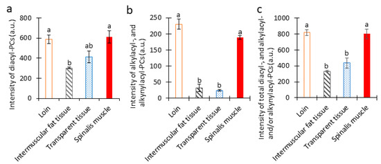 To compare the amounts of the total diacyl-, alkylacyl-, and alkenylacyl-PC species within and between loin, intermuscular fat tissue, transparent tissue, and spinalis muscle, their intensities within each tissue were combined (Figure 6). The amounts of total diacyl-PC species were predominantly higher in loin and spinalis muscle than in transparent and intramuscular fat tissue (Figure 6a). The amounts of total alkylacyl- and/or alkenylacyl-PC species were also significantly higher in both muscles than in the other two tissues (Figure 6b). In fact, the disparity was even greater for these PC species than for the diacyl-PC species. The amounts of total diacyl-, alkylacyl- and/or alkenylacyl-PC species were significantly higher in both muscles than in the other two tissues (Figure 6c).