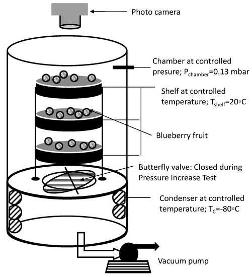 All experiments were carried out in a Martin Christ freeze-dryer, model Alpha 2-4 LSCplus (Martin Christ Gefriertrocknungsanlagen, Osterode, Germany), which can operate at a total vacuum pressure of up to 0.001 mbar, provided with an MKS Baratron 622 capacitance manometer (MKS Instruments) and a condenser that can operate at temperatures down to −85 °C (see Figure 2). It has three shelves of 0.021 m2 each that can be temperature controlled with a wireless temperature monitoring system, which, in turn, allows for sample temperature monitoring through pt100 port sensors. The samples or blueberries were placed onto the three shelves, considering a total load of 60 units. In order to assess the product temperature, one blueberry fruit per shelf was inserted with a miniature pt100 sensor (PT 100 Mini-Epsilon LSC Plus, Martin Chris, ostero de am Harz, Germany). A standard freeze-drying processing condition was fixed at 0.13 mbar (13 Pa) with a condenser temperature of −85 °C and a shelf temperature of 20 °C, while the air temperature was also 20 °C. The freeze-drier system includes dedicated software (SCADA Software V1 LPC plus Martin Chris, ostero de am Harz, Germany) to set, control, and monitor the freeze-drying process at the selected processing condition. It samples data every 5 s. A butterfly valve with an approximate closing time of 0.5 s, mounted in the cylindrical duct connecting the freeze-drying chamber and the condenser chamber, can be managed by the software to perform Pressure Increase Tests (PIT) (Figure 2). The SCADA Software LPC plus software allows graphic visualization and recording of several process variables: tray temperature, blueberry temperature, condenser temperature, chamber absolute pressure (capacitive sensor), and PIT data.