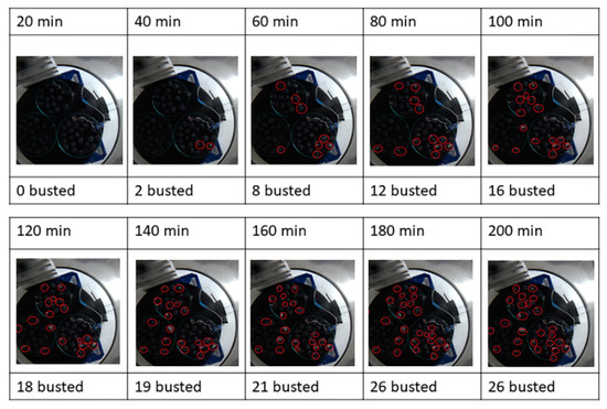 A slide dataset that consists of images extracted from the photo sequence every 20 min was used to visually quantify the fraction of busted blueberries over time; this evolution is depicted in Figure 3. The busted blueberries are identified by red circles, reflecting the progression of the busting process, which starts with zero busted at 20 min and describes a saturation curve, achieving a maximum of 26 busted blueberries at 180 min.