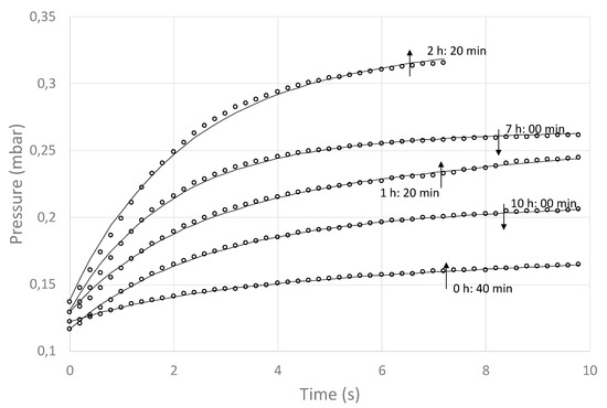 All published studies about the application of the MTM method have used a cylindrical shape (vials in the pharmaceutical industry), where the mass transfer area (A) does not change as the FD proceeds (one-dimensional axial mass transfer). However, assuming a spherical geometry to represent the blueberry shape, area A does change over time. For this reason, in this study, the quotient (AT/RT), was taken as a regression variable, together with Pi and X (see Equation (1)). Experimental data of the pressure rise vs. time over 30 s were generated every 20 min. The pressure rise data were taken at a rate of 100 data/s and then averaged to generate a data set of 5 data points per second. These data were then regressed against Equation (1) to obtain (AT/RT). In order to show the evolution of the process, Figure 6 depicts the first 10 s of some of the pressure rise vs. time experimental data and their respective regression curves. As expected, the regressions showed neglected values for variable X (in the range of 0.001 to 0.0001), indicating a good seaming of the FD system (no air infiltration). Also, the change of Pi values was minor in comparison with the changes of (RT/AT), meaning that the latter is the main agent of chamber pressure rise [28].