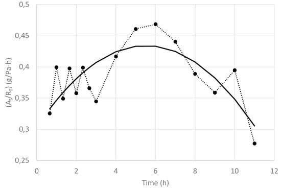 It can be seen that at the beginning (0 h 40 min), the pressure rise was low, and it kept increasing up to 2 h 20 min. Then, it started to decrease, approximating the pressure rise observed at the process initiation (10 h 00 min). The (AT/RT) values obtained by the regression analysis at different processing times, together with a tendency line, are shown in Figure 7.