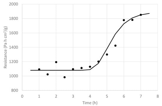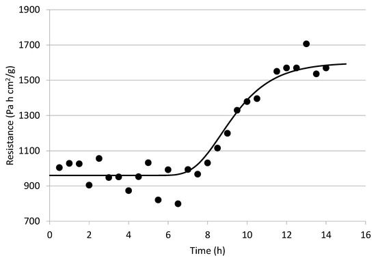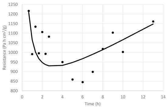 This value started at a low value, which means that a high RT value has an important effect in the quotient (AT/RT), and it increased rapidly over time up to 4 h, as some of the blueberry fruits busted and RT decreased, in spite of the AT value that should have been decreasing during this period. This reveals that the main effect is that given by the important reduction of RT (busting process). If an average AT over time is assumed (for example, AT = 31.4 cm2), the resistance RT as a function of time can be approximated, and its result is shown in Figure 8, including a tendency line, where, contrary to a normal FD process, RT started at a high value and then decreased sharply before finally increasing again.
