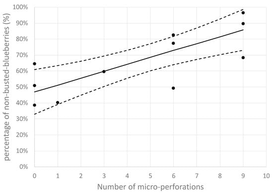It can be seen that there was an important primary drying time reduction of 60.6% when blueberries were cut in half, as compared with that of whole nontreated blueberries. However, this option is associated with the loss of the important quality characteristic of maintaining the fruits’ original shape. On the other hand, and not less importantly, it can be observed that primary drying time reduced by approximately 23.5% when the blueberry skin was pretreated with nine microperforations, as compared with that of whole nontreated blueberries. This result is explained by the fact that the nine-microperforation pretreatment avoids the initial high resistance (RT) at the beginning of the process, mitigating the busting process. This means that, in addition to primary time reduction, CO2 laser microperforation pretreatment can improve the final product quality. It can be seen from Figure 11 that the percentage of nonbusted blueberries significantly increased as the number of perforations per fruit increased, which is statistically sustained by a positive value of the covariance (covariance = +0.634). In addition, the average value of the percentage ofnonbusted blueberries with nine microperforations was 86%, significantly higher than 47% for those with no microperforations. This is supported by their corresponding 95% CIs: