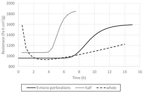 In order to compare all three treatments—whole nontreated, nine-perforation, and cut-in-half blueberries—the tendency lines were represented in the same graph (Figure 15). This figure summarizes the phenomenological effect of the skin and pretreatments on the blueberry freeze-drying, an effect that is reflected by the RT behavior during FD processing. According to the classification made by Pikal et al. [21], the whole nontreated blueberry FD process, as mentioned, would follow a Type II resistance curve; the cut-in-half blueberries would follow a Type IV process with a severe curvature toward the time axis; and finally, the nine-perforation blueberries would exhibit Type III behavior, with a less severe saturation curvature toward the time axis than that of Type IV. These outcomes phenomenologically describe the effect of the skin and pretreatments on the mass transfer process, which is mainly reflected by the evolution of RT throughout the FD processing time.