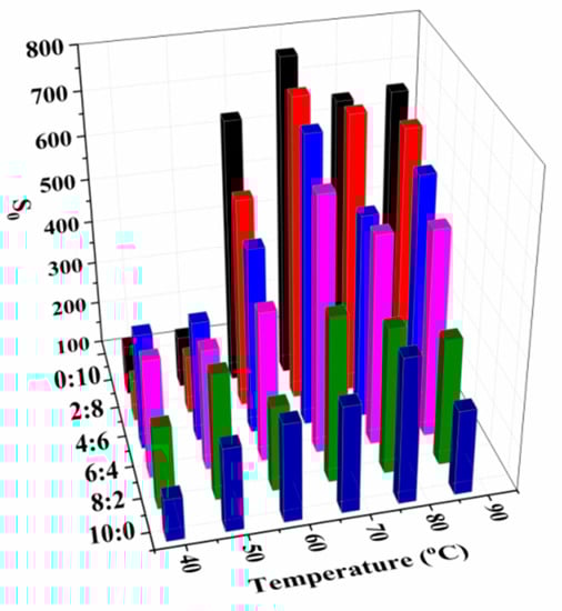 | 8:2 | 0.89 ± 0.26 a | 6.66 ± 2.41 b | 214.69 ± 14.88 a | - | 4.71 ± 1.35 a | 0.59 ± 0.29 a | 94.70 ± 1.59 a | - |
