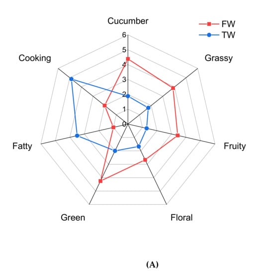 As shown in Figure 1A, seven odor attributes were generally summarized in FW and TW. A pleasant odor, such as “cucumber”, “grass”, and “green” had higher scores in FW. While the scores of unpleasant odor, such as “cooking flavor” and “fatty”, increased in TW significantly. This result was related to FDs increase in the following off-flavor compounds (Table 2): (E)-2-heptenal (fatty, fruity, green), (E)-2-decenal (mechanical, soapy), octanol (metal, burnt), (E)-2-octenol (plastic, soapy), and diisopropyl disulfide (garlic, sulfur). The off-flavor of TW was caused by the combination of multiple above compounds []. In thermally processed muskmelon juice, volatile sulfur compounds, and small molecular aliphatic aldehydes also contributed to the off-odors []. Methanethiol and dimethyl sulfide were the key off-flavor compounds identified in thermal mandarin juices []. Thermal degradation of sulfur-containing amino acids and unsaturated fatty acid, as well as Maillard reactions in juice, contributed to the generation of the thermal-induced off-notes [,].