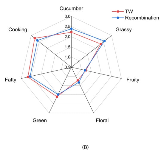 According to the quantitative results of TW, the aroma recombination was carried out to verify the contribution of the seven key off-flavor compounds to the overall flavor of TW. As shown in Figure 1B, the aroma recombination system performance displayed good similarity with TW, with no significant difference between the seven odor attributes (p < 0.05) being observed. This indicated that the identification and quantitation experiments were accurate, and that the aroma-active and key off-flavor compounds were precisely identified [,]. Therefore, (E)-2-heptenal, diisopropyl disulfide, (E)-2-decenal, decanal, (E)-2-octenol, octanol, and hexanol were confirmed as the key off-flavor compounds in TW.