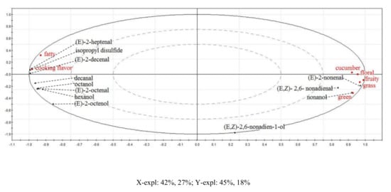 As shown in Figure 2, 7 flavor attributes and 12 compounds (aroma-active compounds and key off-flavor compounds) in FW and TW were selected to conduct PLSR analysis, they were taken as variable X and Y, respectively. The PLSR model provided a two-factor model explaining 69% of the X-variance (flavor attributes) and 63% of the Y-variance (aroma-active compounds and key off-flavor compounds) in Figure 2.