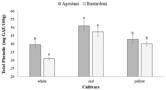“Agostani” fruits of the white cultivar Muscaredda showed a value not significantly (p > 0.05) different in comparison to the “Agostani” and “Bastardoni” yellow cultivar (39.5 ± 2.2 mg GAE/100 g), while “Bastardoni” of the white cultivar registered the significantly (p < 0.05) lowest value of 31.0 ± 0.82 mg GAE/100 g.