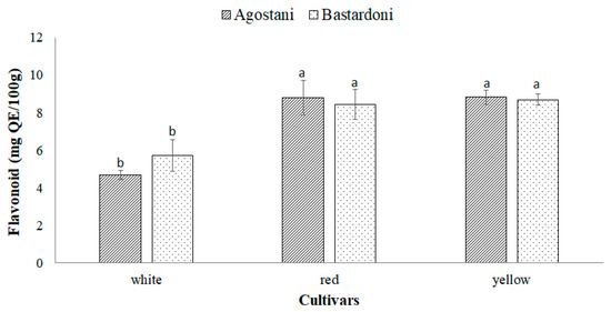 Regarding the total flavonoid content, displayed in Figure 2, both “Agostani” and “Bastardoni” PPJs of the red and yellow cultivars evidenced the average value of 8.7 ± 0.17 mg QE/100 g. Although the content of flavonoids was slightly higher in “Agostani” samples than in “Bastardoni” ones (Figure 2) the differences were not significant (p > 0.05). In comparison to red and yellow cultivars, both “Agostani” and “Bastardoni” of the white cultivar showed the significantly (p < 0.05) lowest flavonoid content of 4.7 ± 0.3 and 5.7 ± 0.8 mg QE/100 g, respectively (Figure 2).