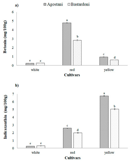 Betanins (Figure 3a) were mostly represented in the red cultivars; in fact, the significantly (p < 0.05) highest value was detected in red “Agostani” fruits (4.8 ± 0.01 mg/100 g), followed by red “Bastardoni” (2.8 ± 0.01 mg/100 g). Furthermore, “Agostani” fruits of the yellow cultivar possessed a significantly higher (1.0 ± 0.02 mg/100 g) amount of betanin, if compared to the yellow cultivar of “Bastardoni” crop production (0.6 ± 0.00 mg/100 g). White cultivar registered the lowest values (0.2 ± 0.01 and 0.3 ± 0.01 mg/100 g for “Agostani” and “Bastardoni”, respectively) with no significant differences (p > 0.05) between the two crop productions.