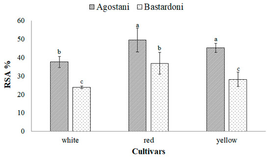 The significantly (p < 0.05) lowest values of RSA % were recorded in white and yellow cultivars of “Bastardoni” crop production (23.8 ± 0.6 and 28.1 ± 3.9, respectively).