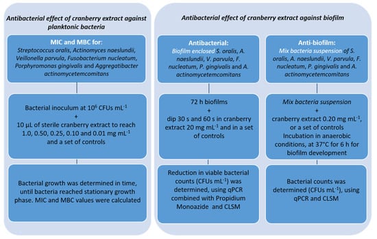 Figure 1 shows the experimental design followed for the study of the antibacterial effects of cranberry against planktonic bacteria and in an oral biofilm model.