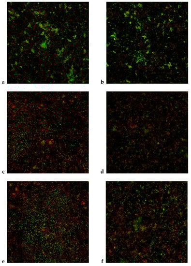 Maximum projection of confocal laser scanning microscopy (CLSM) images of the whole biofilm after 6 h of development, growing in the presence of 0.20 mg mL−1 of cranberry extract, over hydroxyapatite surfaces, and stained with LIVE/DEAD® BacLightTM Bacteria Viability Kit, after exposure to: (a,b) negative control (phosphate buffer saline, PBS); (c,d) cranberry extract; (e,f) 4% dimethyl sulfoxide (DMSO) solution.