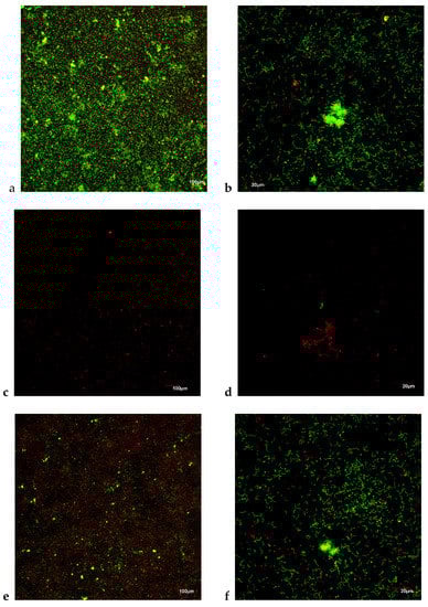 Maximum projection of confocal laser scanning microscopy (CLSM) images of the whole biofilm, grown 72 h over hydroxyapatite surfaces, and stained with LIVE/DEAD® BacLightTM Bacteria Viability Kit, after exposure to: (a,b) negative controls, 30 and 60 s, respectively (phosphate buffer saline, PBS); (c,d) 4% dimethyl sulfoxide (DMSO) solution, 30 and 60 s, respectively; (e,f) cranberry extracts (20 g L−1), 30 and 60 s, respectively. (Scale bar = 100 µm).
