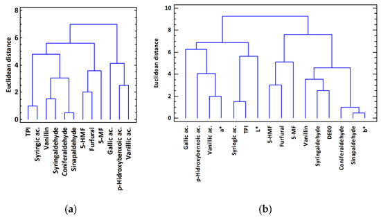 To globally analyze the obtained results, a study of the studied variables was carried out by means of a cluster analysis, so as to determine which variables behaved similarly in the studied samples. Figure 1a shows the obtained cluster using the Euclidean distance as metrics and the Ward method as clustering rule for the standardized variables related to the phenolic content. It shows a clear distinction into four clusters of variables: Phenolic aldehydes, furanic aldehydes, phenolic acids, and TPI together with syringic acid. This proves that there is a relationship between the behavior of the variables during aging and the chemical nature of such aging. If the chromatic variables are included in the study (Figure 1b), we can observe that component a* is related to the content in phenolic acids (vanillic ac, p-hydroxybenzoic ac., and gallic ac.), component b* and ΔE00, with the content in phenolic aldehydes, and L* with TPI and syringic acid. This indicates a clear correlation between the chromatic variables and the content in phenolic compounds in the samples.
