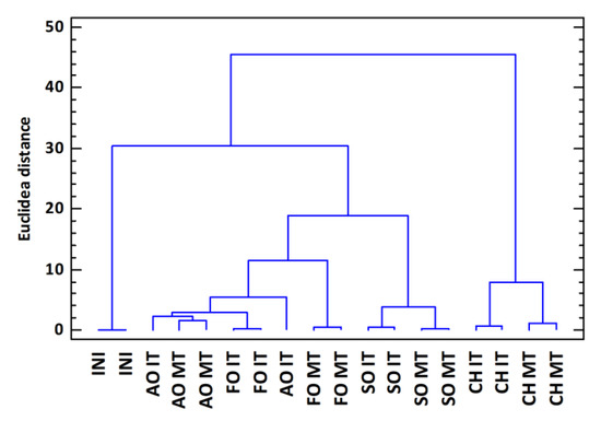 Cluster analysis obtained using the Euclidean distance as metrics and the Ward method as clustering rule for the analyzed samples using as variables the phenolic compounds, the TPI, and the chromatic variables (INI: Initial distillate; AO: American oak; FO: French oak; SO: Spanish oak; CH: Chestnut; IT: Intense toasting level; MT: Medium toasting level).