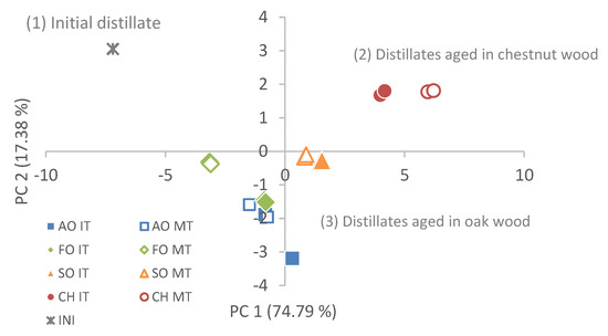 If a Principal Component Analysis (PCA) is carried out taking into account the phenolic compounds, the TPI, and the content in organic acids, three main components explain 97.8% of the total accumulated variability: PC1 explains 74.8% of the variability of the data, PC2, 17.4%, and PC3, 5.6%. In Table 5, the weights of the variables for each component are shown. The scatter plot of the samples consisting of PC1 and PC2 is shown in Figure 3. The samples can once again be grouped into three groups: (1) The initial distillate, (2) the distillates aged in chestnut wood, and (3) the samples aged in oak wood. Within this last group, those samples aged in SO form their own group again, those aged in FO-MT form another subgroup, and the last subgroup consists of those aged in AO and FO-IT.