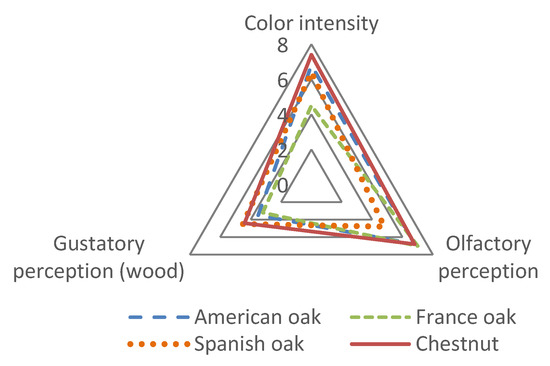 As regards the type of wood, the visual perception (color intensity), the olfactory perception, and the gustatory perception were assessed. As regards visual perception, the assessors considered that those distillates aged in CH presented the highest color intensity and were also the best valued ones. The samples aged in FO barrels presented, on the other hand, the lowest color intensity. This result agrees with the data obtained for the ciede2000 parameter, as has been already mentioned in Section 3.4. Chromatic characteristics. As regards the gustatory perception, the assessors perceived a certain sweet taste, with vanilla and wood notes. The distillates aged in CH and SO were the ones which presented the highest scores in the gustatory perception, especially as regards the wood note. In relation to the olfactory perception, the best valued samples were those aged in CH, AO, and FO, presenting similar scores and higher than those for SO. Those distillates aged in SO did not present a highly positive olfactory perception despite the fact that they are the ones which, together with CH, presented the highest intensity in aroma (Figure 4).