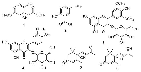 Chemical structures of compounds 1–6. 1,5-Dimethyl citrate (1), 5-methoxysalicylic acid (2), syringetin-3-O-glucoside (3), isorhmanetin-3-O-glucoside (4), (+)-dehydrovomifoliol (5), and (+)-vomifoliol (6).