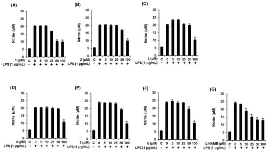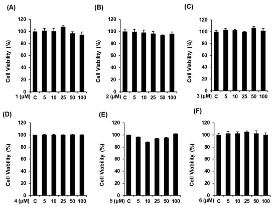 Prior to evaluating the effect of the compounds on NO production, we determined their cytotoxicity in RAW 264.7 mouse macrophages using an Ez-Cytox cell viability assay. As a result, the compounds were considered to be cytotoxic when the cell viability in the compound-treated group was less than 80% of that in the untreated group. At all tested concentrations, all concentrations of compounds 1–6 had no cytotoxicity on RAW 264.7 mouse macrophages (Figure 2). Therefore, all concentrations were employed for the subsequent experiments.