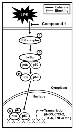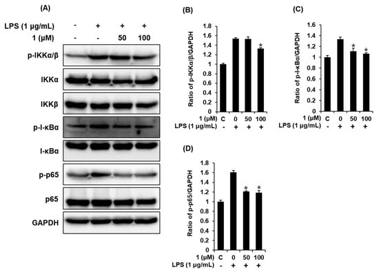 When macrophages are stimulated with LPS, IKKα/β is phosphorylated, thereby leading to the subsequent phosphorylation and degradation of IκBα, which enables the nuclear translocation of NF-κB [28]. NF-κB p65 is a core mediator of the innate immune response that leads to the transcription of genes encoding pro-inflammatory mediators, such as iNOS and COX-2, and pro-inflammatory cytokines, such as TNF-α and IL-6 [29,30]. Therefore, to confirm whether pre-treatment with compound 1 could suppress LPS-stimulated NO production through the NF-κB p65 signaling pathway, we determined the effect of compound 1 on the expression of IKKα/β, I-κBα, and NF-κB p65 in LPS-stimulated RAW 264.7 mouse macrophages. As shown in Figure 4, exposure to 1 μg/mL LPS significantly upregulated IKKα/β, I-κBα, and NF-κB p65; however, pretreatment with 50 and 100 μM of compound 1 reversed these changes induced by LPS. Such findings indicate that compound 1 inhibits NO production by inhibiting the phosphorylation of IKKα/β, I-κBα, and NF-κB p65 in RAW 264.7 macrophages. On the basis of these results, it appears that the action site of compound 1 is upstream of the IKK site, thus modulating inflammatory mediator expression.