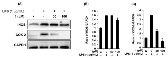 RAW 264.7 cells were plated in 6-well plates at a density of 2 × 105 cells/well and incubated for 24 h at 37 °C. Cells were exposed to 50 and 100 μM of compound 1 for 1 h at 37 °C prior to incubation with 1 μg/mL LPS for 24 h at 37 °C. Whole-cell extracts were then prepared using radio immunoprecipitation assay buffer (RIPA buffer; Cell Signaling Technology, Inc., Beverly, MA, USA) containing 1× ethylenediaminetetraacetic acid (EDTA)-free protease inhibitor cocktail and 1 mM phenylmethylsulfonyl fluoride (PMSF), according to the manufacturer’s instructions. Protein concentration of the whole-cell extracts was determined with a bicinchoninic acid (BCA) protein assay kit. Proteins (20 μg/lane) were subjected to 10% sodium dodecyl sulfate polyacrylamide gel electrophoresis (SDS–PAGE) for 90 min at 110 V, transferred to a polyvinylidene fluoride (PVDF) membrane, and analyzed with epitope-specific primary antibodies to phospho-IκB kinase (IKK)α/β, IKKα (IκB kinase alpha), IKKβ (IκB kinase beta), I-κBα (inhibitor of kappa B alpha), phospho-I-κBα, phospho-NF-κB p65, NF-κB p65, and iNOS, followed by cyclooxygenase-2 (COX-2), glyceraldehyde 3-phosphate dehydrogenase (GAPDH), and horseradish peroxidase (HRP)-conjugated anti-rabbit antibodies (Cell Signaling, MA, USA). The bound antibodies were then visualized with ECL Advance Western Blotting Detection Reagents (GE Healthcare, Cambridge, United Kingdom) and a FUSION Solo Chemiluminescence System (PEQLAB Biotechnologie GmbH, Erlangen, Germany). The optical densities of the immunoreactive bands were obtained using ImageJ software (Version 1.51J; National Institutes of Health, Bethesda, MD, USA) and normalized with those of the control. Data represented by fold-increases were compared to the control. The GAPDH was used for loading control.