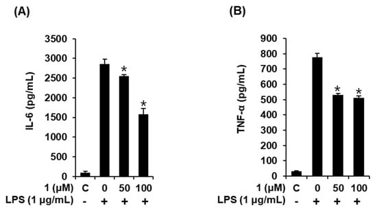 RAW 264.7 cells were plated in 24-well plates at a density of 4 × 105 cells/well and incubated for 24 h at 37 °C. Cells were then exposed to compound 1 at concentrations of 50 and 100 μM for 1 h at 37 °C prior to incubation with 1 μg/mL LPS for 24 h at 37 °C. To determine IL-6 and tumor necrosis factor alpha (TNF-α) production, the supernatant was obtained and assayed to quantify the levels of these cytokines using an IL-6 sandwich enzyme-linked immunosorbent assay (ELISA) kit (BD Biosciences, CA, USA) and a TNF-α ELISA kit (eBiosciences, CA, USA), according to the manufacturer’s instructions.