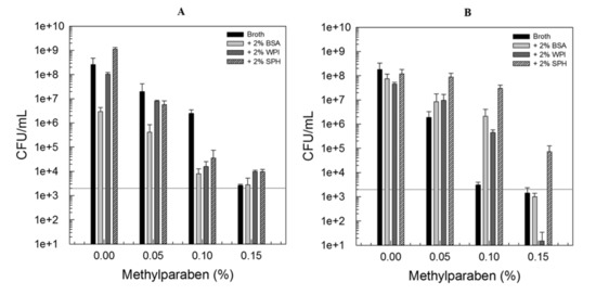It is generally known, that the antimicrobial efficacy of parabens increases as the chain length of the ester group increases and therefore polarity decreases [16]. However, this is also related to a decrease in water solubility, a key property for antimicrobial efficacy against bacteria that are usually located in the water phase of a food matrix. Therefore, methylparaben seems to be the most suitable paraben to control bacterial growth in food products. Methylparaben did not cause a lethal effect but a strong inhibition of microbial growth in dependency of the concentrations used (0%–0.15%). Figure 1 compares the number of viable counts detected after 12 days of incubation at 4 °C in the absence or presence of 2% BSA, WPI, or SPH, and 0%–0.15% methylparaben. Results for L. innocua LTH3096 are presented in Figure 1A, those for P. fluorescens DSM50091 are presented in Figure 1B.