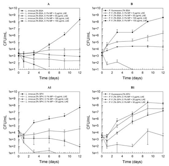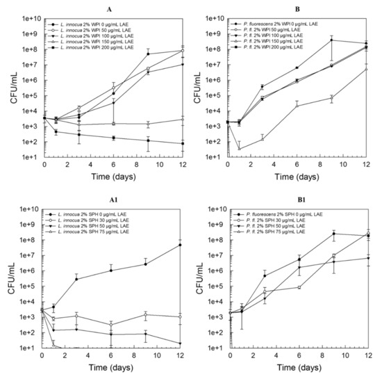 Figure 2 demonstrates the growth behavior of L. innocua LTH3096 (A, A1) and P. fluorescens DSM50091 (B, B1) when exposed to sub-lethal concentrations of LAE. Independent of the type of protein used, it can be clearly seen that the Gram-positive strain was already remarkably affected by lower concentrations, and hence “bacteriostatic” effects could already be observed with LAE concentrations of 150 µg/mL or 30 µg/mL for WPI (Figure 2A) or SPH (A1), respectively. In the case of P. fluorescens DSM50091, lower concentrations were sufficient to cause a lethal effect, however, higher sub-lethal LAE concentrations were needed to cause a pronounced growth inhibition. For example, 150 µg/mL LAE just lead to an initial ~1.5 log reduction followed by regrowth in model systems containing 2% WPI and thus a high number of viable counts (~107 CFU/mL) could be detected after 12 days of storage at 4 °C (Figure 2B). This relationship was also found in the presence of SPH (Figure 2B1) and BSA (data not shown).