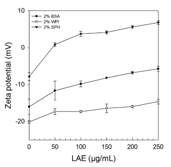 Zeta potential measurement: Microelectrophoretic measurements (Zetasizer Nano ZS, Malvern Instruments, UK) were used to provide additional information about the ingredient interactions between positively charged LAE and the different proteins at a pH of 6 ± 0.1. The Zeta potential is thereby indicative of the charge of potential complexes formed. The concentration of either BSA, WPI, or SPH was kept constant within the samples (2% protein), while the LAE concentration was varied (0–500 µg/mL). A minimum of two independent samples were analyzed for each treatment, and each sample was analyzed in duplicate.