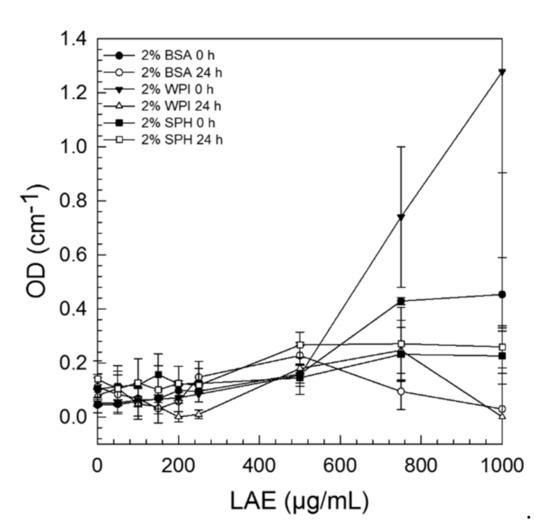 Turbidity measurement: Complex formation can also be studied by recording changes in the solution turbidity. Therefore, turbidity measurements of solutions containing LAE (0–1000 µg/mL; applied as LAE/Tween 80 solution: 1:1) and either 2% BSA, WPI, SPH were determined using a microtiter assay. The solutions were pipetted into 96-well plates with a volume of 300 µL per well (Falcon, BD Biosciences GmbH, Heidelberg Germany). The optical density (OD) of the mixtures was measured after preparation and after 24 h of storage at 4 °C, using a synergy HT Multi-Mode Microplate Reader (BioTek Instruments, Inc., Bad Friedrichshall, Germany). Results are based on two independent measurements examined in duplicate.