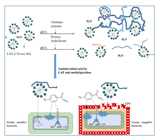 Our results have shown that the formation of complexes between proteins and ionic LAE is apparently of electrostatic origin and that hydrophobic interactions contribute to the formation. The structure of these complexes depends on the LAE concentration used and is thus directly related to its antimicrobial efficacy. In contrast to LAE, methylparaben seems to not be involved in complex formation, however, some interactions may take place between the alkyl chain of this ester and hydrophobic amino acids, such as leucine or proline. Based on the extent of activity losses as a consequence of complex formation, LAE can be classified as a structure-sensitive component, whereas methylparaben can be classified less structure-sensitive. Although an exact cause-and-effect relation for the mode of action of LAE and methylparaben is yet not established, summarizing findings from other authors and taking our results into account, one can suggest the following physicochemical and antimicrobial mechanisms in presence of proteins (Figure 6):