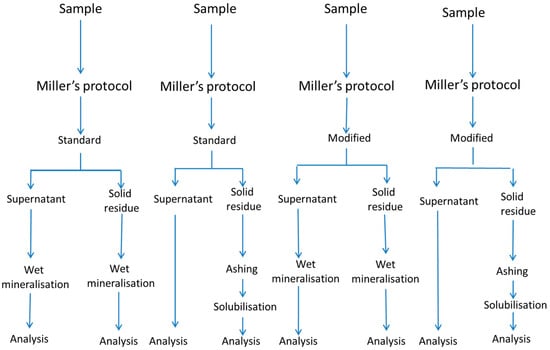The modification consisted of adding 10 mL, or 125 mL, of water to the digested residues from the standard Miller’s or Crews’ protocols, respectively, incubating the suspension again in a shaking water bath at 37 °C and 110 rpm for 2 h, and centrifuging at 15,000× g (Miller’s protocol) or 30,000× g (Crews’protocol) and 4 °C for 60 min (Sorvall RC6 plus centrifuge). The supernatant was combined with that from the standard protocol to form the supernatant of the modified technique. The mineral content in these supernatants and their respective re-extracted solid residues were determined. The resulting methodology will be onwards referred to as the modified protocol.