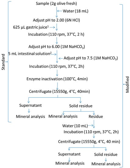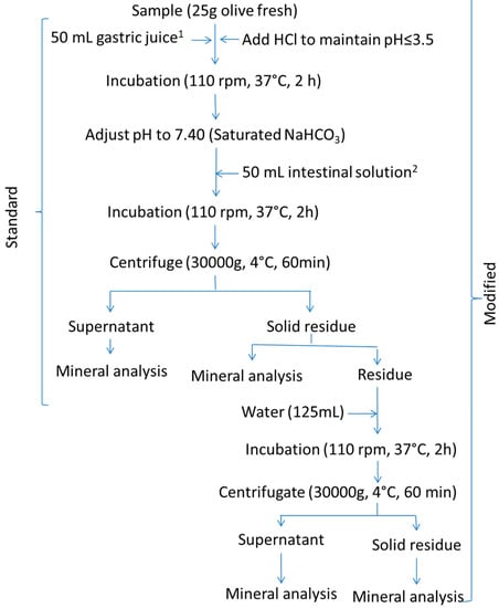 The procedure described in Crews, Burrell, and McWeeny [9,10] was followed (Figure 3, standard). Briefly, 25 g of homogenised olive pulp (an aliquot of the 100 g ripe olive sample) was weighed and suspended in 50 mL of simulated gastric juice, prepared by dissolving 10 mg/mL of pepsin in saline hydrochloric acid (0.15 M sodium chloride; 0.02 M hydrochloric acid) at pH 1.8. The suspension was incubated at 37 °C and 150 rpm for 2 h and 6 N HCl was added as necessary to maintain pH ≤ 3.5. After incubation, the suspension pH was adjusted to 7.4 with a saturated NaHCO3 solution and was added to 50 mL of simulated intestinal juice, prepared by mixing equal volumes of (a) 30 mg/mL pancreatin plus 10 mg/mL of amylase and (b) 1.5 g/L of bile salts in 0.15 M NaCl. The mixture was again incubated at 37 °C and 150 rpm for 2 h and centrifuged at 30,000× g and 4 °C for 60 min (Sorvall RC6 plus centrifuge, Thermo Scientific, Langenselbold, Germany). The weights and mineral concentrations in the supernatant and the solid residue were calculated as described in Miller’s protocol.