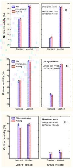 The weights of the raw materials, blank solutions and the different digestion fractions required for evaluating the mineral recovery are shown in Table 3. The markedly higher weights of olive samples and digested fractions in the Crews’ technique are apparent. When applying the modified protocols, the weights of supernatants are the sum of those from the standard supernatant solutions of enzymes plus those from the post-digest re-extraction. From the data in Table 1, Table 2 and Table 3, the bioaccessibility of the minerals were estimated (Equation (1)). Overall, the mineralisation system had scarce or no effect on the bioaccessibility results. Regarding digestion methods, the bioaccessibilities of Na and K (Figure 4a,b) were markedly higher in Miller’s than in Crews’ standard protocols, but the application of the modified protocol considerably increased them to values greater than 90% (mainly in Crews’ methodology), with only slight differences between protocols in the case of Na and a significant difference in favour of Miller’s for K. Hence, the notable increase in the recuperation of these elements with the post-digest re-extraction means that they could be completely bioaccessible from ripe olives (progressive dilution and absorption from the human gut), as confirmed by their weak interaction with the flesh components and as already suggested in the literature for other foods [9,10].