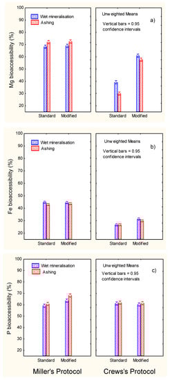 In vitro gastrointestinal digestion of ripe olives. Effect of digestion protocol (Miller vs. Crews), and digestion type (standard vs. modified) and mineralisation system (wet vs. ashing) on bioaccessibility (%) of (a) Mg, (b) Fe, and (c) P.