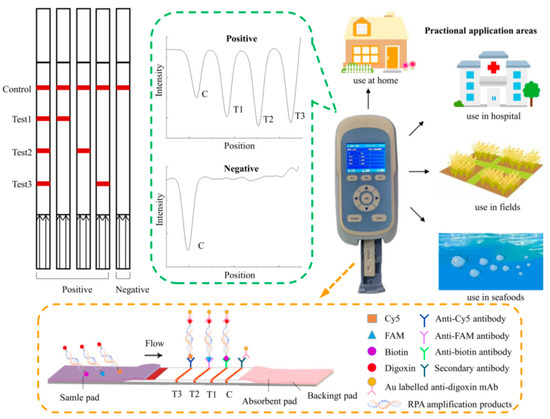 In order to simplify the experimental steps and reduce the dependence on the instrument, various isothermal amplifications of nucleic acids have been developed. Recombinase polymerase amplification (RPA) is one of the representative isothermal amplification techniques for the detection of nucleic acid [16]. The assay uses a recombinase enzyme to facilitate the binding of oligonucleotide primers to their complementary sequences of double-stranded DNA molecules. The process is aided by the single-stranded DNA binding protein, which prevents dissociation of the primers. The replication is performed by a DNA polymerase, which has the strand-displacement activity necessary to synthesize a new complementary DNA strand [17]. The amplified products can be detected after being incubated at 37–42 °C in 5–20 min [18]. Accurate and simple readouts are important for the analysis of amplification products. The gel electrophoresis, fluorescence labeling, and lateral flow immunoassays have served for the analysis of RPA amplicons [19]. The lateral flow dipstick (LFD) is a simple, fast, and visual immune assay for amplified product detection. The testing is achieved by binding to a tag-specific antibody at the detection line and then cross-linking it with a second tag-specific antibody on colloid gold nanoparticles [20,21]. After 5–10 min of incubation, results can be observed by colored signals in a control line and test line. They can be semi-quantitatively analyzed and are directly observable by the naked eye. The LFD-RPA assay has been applied for a number of pathogens, including Mycobacterium avium [22], Agrobacterium spp. [23], Listeria monocytogenes [24], and Streptococcus pneumoniae [25]. However, previous studies have focused on single targets. It is challenging for multiple detection to avoid the cross-reaction between several specific antibodies in the dipstick.