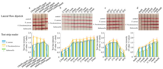 Primers for the Vibrio parahaemolyticus fragment were decreased to 150 nM, and a range of concentrations of the primers for the Staphylococcus aureus and Salmonella Enteritidis fragments (150–500 nM) were evaluated. The optimization experiments were conducted at 37 °C, with an incubation time of 20 min. After that, the amplification products were analyzed by using a lateral flow immunoassay. In terms of the equivalent amplification efficiency, the results were obtained when using 150 nM Vibrio parahaemolyticus, 400 nM Staphylococcus aureus, and 400 nM Salmonella Enteritidis primers (Figure 2a). The reaction times of 2.5, 5, 7.5, 10, 12.5, 15, 17.5, 20, 22.5, and 25 min were evaluated. The signal on the lateral flow dipstick could be detected after 5 min at 37 °C. The intensity of the band increased with longer reaction times (Figure 2b). The band was brighter when the amplification time was 20 or 25 min, but the reaction time was longer. As a result, 10 min was the appropriate reaction time. The RPA assay was conducted under isothermal conditions between 30 and 50 °C. According to the results of strips and the test strip reader, the best reaction temperature of the LFD-RPA assay was 37 °C (Figure 2c). Subsequently, seven magnesium ion concentration gradients of 0, 2.8, 5.6, 8.4, 11.2, 14, and 16.8 mM were tested. As shown in Figure 2d, there were no obvious differences between the magnesium ion concentrations from 14 to 16.8 mM. Therefore, 14 mM magnesium acetate was found to provide an optimal performance for the LFD-RPA assay.