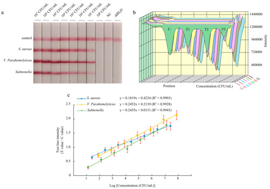 To assess the sensitivity of the multiplex LFD-RPA assay, 10-fold serial dilutions of pure bacteria solution were prepared, and the purified bacterial genomic DNA was used as a template. The amplification products were analyzed by a lateral flow immunoassay. The color of the test lines was not visible to the naked eye when bacterial concentrations were below 101 CFU/mL for Staphylococcus aureus, Vibrio parahaemolyticus, and Salmonella Enteritidis (Figure 3a). Therefore, the visual detection limits of multiplex LFD-RPA for the simultaneous detection of Staphylococcus aureus, Vibrio parahaemolyticus, and Salmonella Enteritidis were 2.6 × 101, 7.6 × 101, and 1.29 × 101 CFU/mL, respectively. Using the strip test reader to detect the intensity of the colored signal on the test lines, it is possible to achieve quantitative results. The colored signal intensity increased with a high concentration of DNA template (Figure 3b). The standard linear curves have correlation coefficients of determination for Staphylococcus aureus (R2 = 0.9903), Vibrio parahaemolyticus (R2 = 0.9928), and Salmonella Enteritidis (R2 = 0.9945) (Figure 3c). There were significant correlations between the detection threshold and the template concentration. Moreover, the detection limit of the reader was 2.6 × 101 CFU/mL for Staphylococcus aureus, 7.6 × 101 CFU/mL for Vibrio parahaemolyticus, and 1.29 × 101 CFU/mL for Salmonella Enteritidis.
