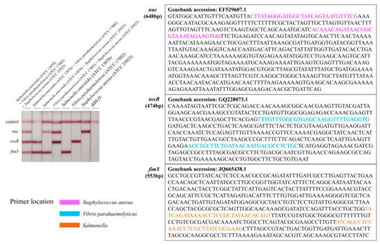 Specificity between the nuc gene for Staphylococcus aureus, toxR gene for Vibrio parahaemolyticus, and fimY gene for Salmonella enterica and the primer location in genes.