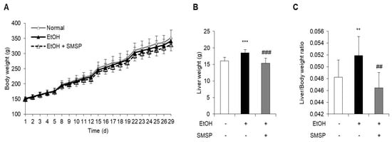 Effect of steamed and freeze-dried mature silkworm larval powder (SMSP) on body weight and liver weight in rats treated with ethanol (EtOH) for 4 weeks. (A) Body weight changes, (B) liver weight at the end of experiment, and (C) liver/body weight ratio were measured. The data represent mean ± SD (n = 8); ** p < 0.01 and *** p < 0.001 vs. normal group; ## p < 0.01 and ### p < 0.001 vs. EtOH group.