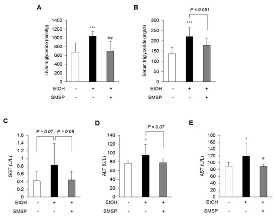 SMSP administration alleviates hepatic steatosis in EtOH-treated rats. (A) Hepatic triglyceride and serum levels of (B) triglyceride, (C) gamma-glutamyl transpeptidase (GGT), (D) alanine aminotransferase (ALT), (E) aspartate aminotransferase (AST) were measured. The data represent mean ± SD (n = 8); * p < 0.05 and *** p < 0.001 vs. normal group; # p < 0.05 and ## p < 0.01 vs. EtOH group.